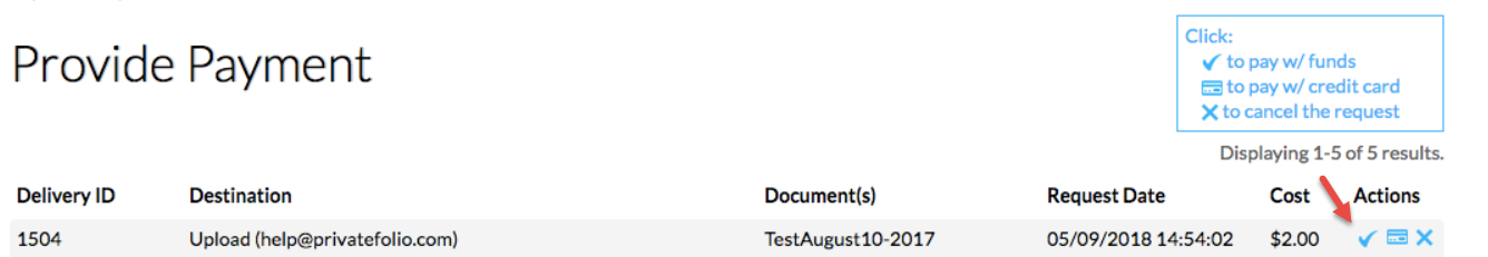 9. Click the checkmark to approve payment ($2) using the funds in your account balance. If you don't have funds available, click the credit card icon to pay by credit card.